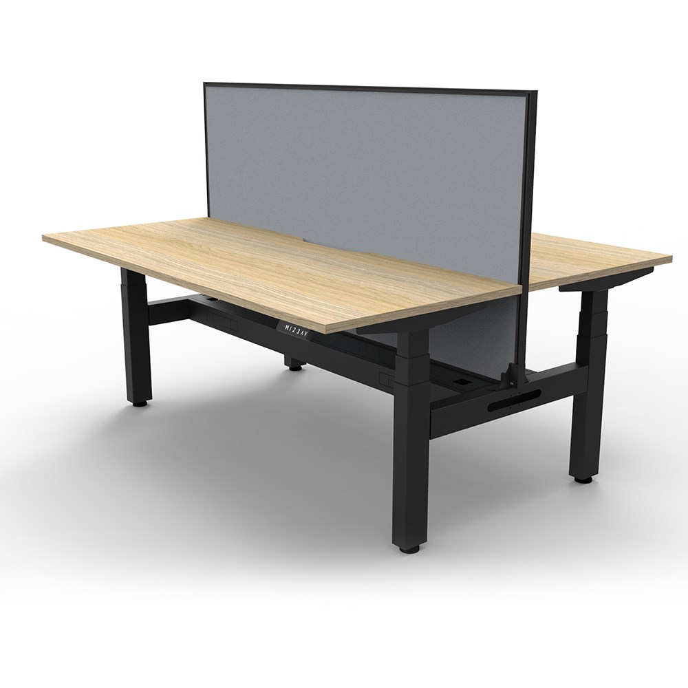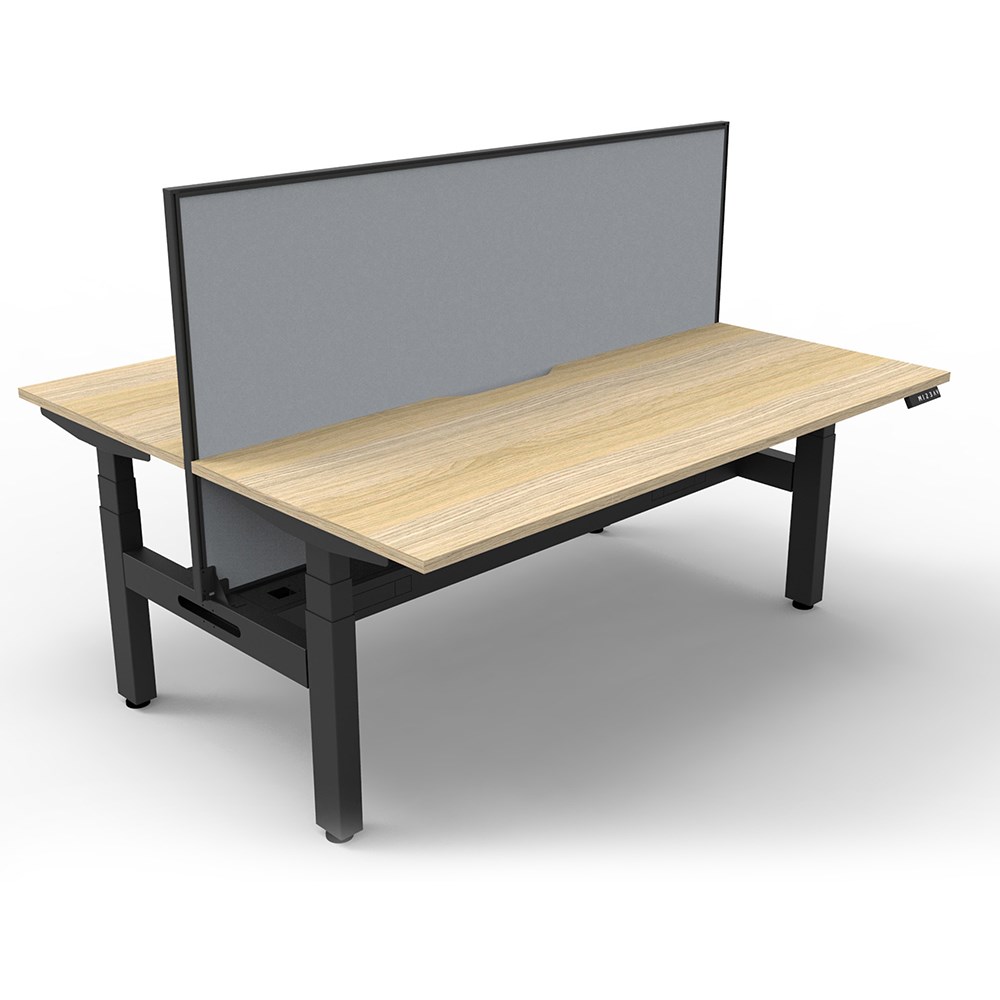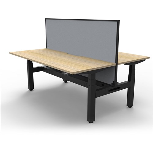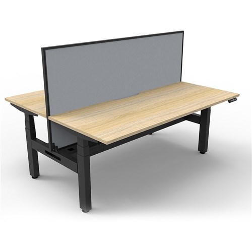 The entire Boost+ range has now been performance tested and is compliant to the AFRDI standards for general safety, strength, durability and stability in all sizes and configurations based on AS/NZS 4442:201. Unit Dimension: 1200mm W x 1500mm D x 1330mm H (Overall). Per User: 1200mm W x 750mm D. Desk Height: 620-1270mm H. Includes pinnable privacy screen in grey fabric with matching black powder coated frame. 900mm H x 30mm T. Smooth and quiet adjustment at 38mm per second. Min Digital control panel with 3 pre-set positions, LED display panel, keypad safety lock and reminder alarm setting. Natural Oak coloured worksurface with 750mm depth top. 50mm D scallop cut out to rear. Back to Back Workstation with Screen and Cable Tray. Dual motor 3 stage motorised legs. 140kg weight loading capacity. 10 Year Manufacturer's Warranty. Delivery, installation and assembly charges may apply to furniture. Please enquire to confirm.