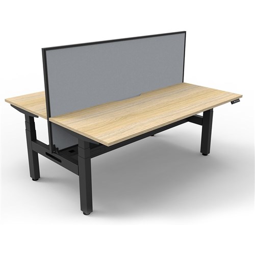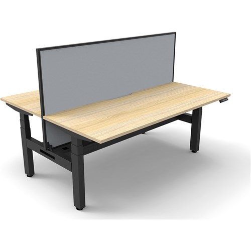 The entire Boost+ range has now been performance tested and is compliant to the AFRDI standards for general safety, strength, durability and stability in all sizes and configurations based on AS/NZS 4442:201. Unit Dimension: 1800mm W x 1500mm D x 1330mm H (Overall). Per User: 1800mm W x 750mm D. Desk Height: 620-1270mm H. Includes pinnable privacy screen in grey fabric with matching black powder coated frame. 900mm H x 30mm T. Smooth and quiet adjustment at 38mm per second. Min Digital control panel with 3 pre-set positions, LED display panel, keypad safety lock and reminder alarm setting. Natural Oak coloured worksurface with 750mm depth top. 50mm D scallop cut out to rear. Back to Back Workstation with Screen and Cable Tray. Dual motor 3 stage motorised legs. 140kg weight loading capacity. 10 Year Manufacturer's Warranty. Delivery, installation and assembly charges may apply to furniture. Please enquire to confirm.