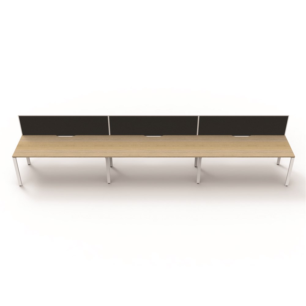 Maximise space and create an efficient working environment with Deluxe Rapid Infinity. Configure multiple workstations together to create pods of desks. Overall: 5400mm W x 780mm D x 1200mm H (including screen). Per User: 1800mm W x 750mm D x 730mm H. 495mm H x 30mm T pinnable privacy screen upholstered in black fabric with matching white powder coat extrusion. Natural Oak worksurface with 410mm W x 50mm D scallop cable access. 60mm x 30mm Profile Leg adds a minimalist look to each workstation. Deeper 750mm top. Double support rail for extra strength. E0 Enviroboard. 5 Year Manufacturer's Warranty. Delivery, installation and assembly charges may apply to furniture. Please enquire to confirm.