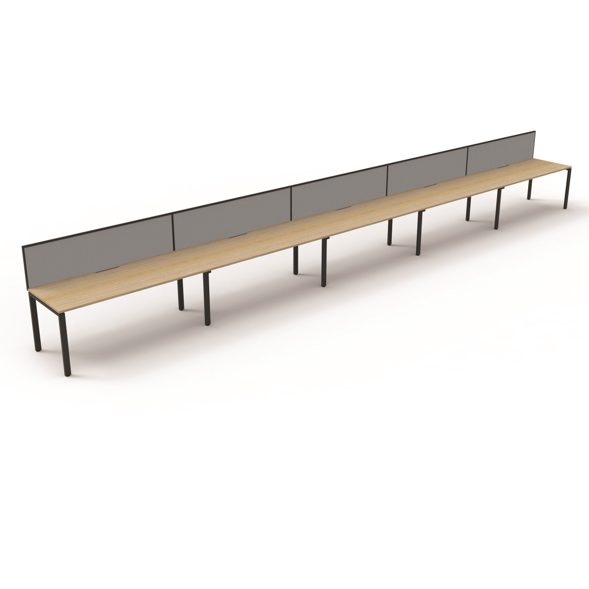 Maximise space and create an efficient working environment with Deluxe Rapid Infinity. Configure multiple workstations together to create pods of desks. Overall: 7500mm W x 780mm D x 1200mm H (including screen). Per User: 1500mm W x 750mm D x 730mm H. 495mm H x 30mm T pinnable privacy screen upholstered in grey fabric with matching black powder coat extrusion. Natural Oak worksurface with 410mm W x 50mm D scallop cable access. 60mm x 30mm Profile Leg adds a minimalist look to each workstation. Deeper 750mm top. Double support rail for extra strength. E0 Enviroboard. 5 Year Manufacturer's Warranty. Delivery, installation and assembly charges may apply to furniture. Please enquire to confirm.