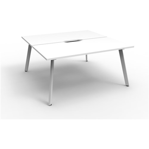 Natural White worksurface with 410mm W x 50mm D white frame. Scallop cable access. No screen. Overall: 1200mm W x 1530mm D x 730mm H. Per User: 1200mm W x 750mm D x 730mm H. 60mm x 30mm splayed leg with power coated underframe. Adjustable levelling feet. 30mm cable access void in between double sided users. Infill rail available at an additional cost. Dual cross bar for added stability. E0 Enviroboard. 5 Year Manufacturer's Warranty. Delivery, installation and assembly charges may apply to furniture. Please enquire to confirm.