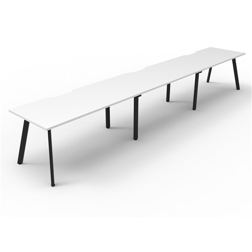 Natural White worksurface with 410mm W x 50mm D with black frame. Scallop cable access. No screen. Overall: 5400mm W x 750mm D x 730mm H. Per User: 1800mm W x 750mm D x 730mm H. 60mm x 30mm splayed leg with power coated underframe. Dual cross bar for added stability. E0 Enviroboard. Adjustable levelling feet. 5 Year Manufacturer's Warranty. Delivery, installation and assembly charges may apply to furniture. Please enquire to confirm.