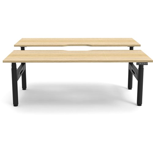 Natural Oak top with Black frame. Unit Dimension: 1200mm W x 1500mm D x 620-1270mm H. 750mm depth per user. E0 rated top. Powdercoat base. Digital control panel with 3 pre-set positions, LED display panel, keypad safety lock & reminder alarm setting. Anti-collision technology, noise emission of less than 50DB. Lifting capacity of 120kg with a max speed of 38mm per second. 70mm diameter round column legs. 700mm wide foot size with adjustable leveling feet, return foot: 700mm. 10 Year Manufacturer's Warranty. Delivery, installation and assembly charges may apply to furniture. Please enquire to confirm.