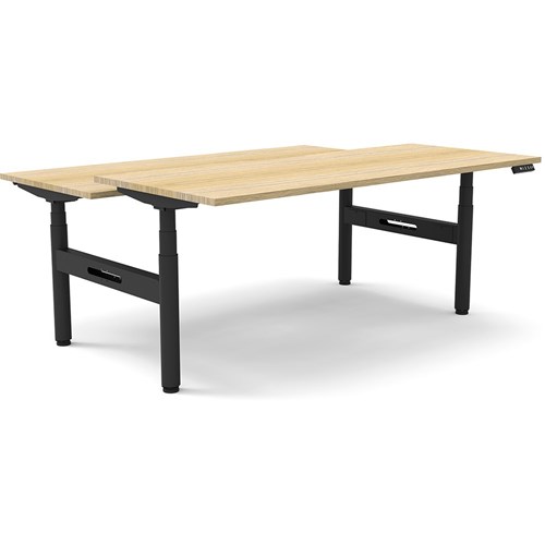 Natural Oak top with Black frame. Unit Dimension: 1500mm W x 1500mm D x 620-1270mm H. 750mm depth per user. E0 rated top. Powdercoat base. Digital control panel with 3 pre-set positions, LED display panel, keypad safety lock & reminder alarm setting. Anti-collision technology, noise emission of less than 50DB. Lifting capacity of 120kg with a max speed of 38mm per second. 70mm diameter round column legs. 700mm wide foot size with adjustable leveling feet, return foot: 700mm. 10 Year Manufacturer's Warranty. Delivery, installation and assembly charges may apply to furniture. Please enquire to confirm.