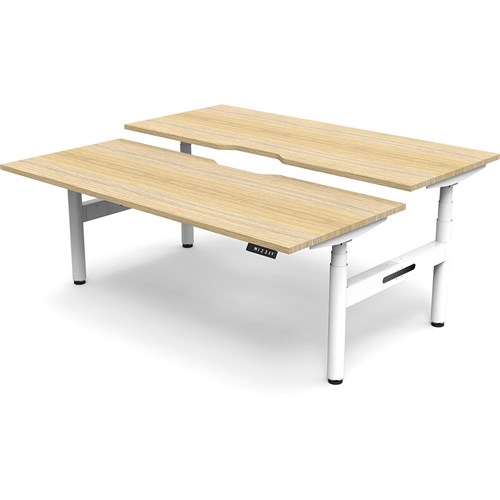 Natural Oak top with White frame. Unit Dimension: 1500mm W x 1500mm D x 620-1270mm H. 750mm depth per user. E0 rated top. Powdercoat base. Digital control panel with 3 pre-set positions, LED display panel, keypad safety lock & reminder alarm setting. Anti-collision technology, noise emission of less than 50DB. Lifting capacity of 120kg with a max speed of 38mm per second. 70mm diameter round column legs. 700mm wide foot size with adjustable leveling feet, return foot: 700mm. 10 Year Manufacturer's Warranty. Delivery, installation and assembly charges may apply to furniture. Please enquire to confirm.