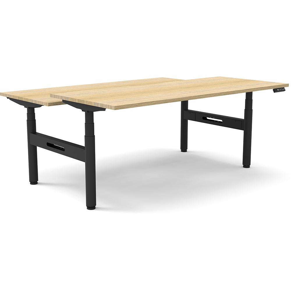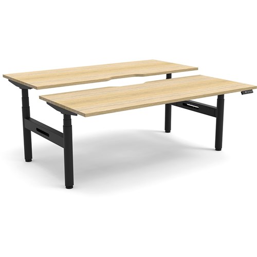 Natural Oak top with Black frame. Unit Dimension: 1800mm W x 1500mm D x 620-1270mm H. 750mm depth per user. E0 rated top. Powdercoat base. Digital control panel with 3 pre-set positions, LED display panel, keypad safety lock & reminder alarm setting. Anti-collision technology, noise emission of less than 50DB. Lifting capacity of 120kg with a max speed of 38mm per second. 70mm diameter round column legs. 700mm wide foot size with adjustable leveling feet, return foot: 700mm. 10 Year Manufacturer's Warranty. Delivery, installation and assembly charges may apply to furniture. Please enquire to confirm.