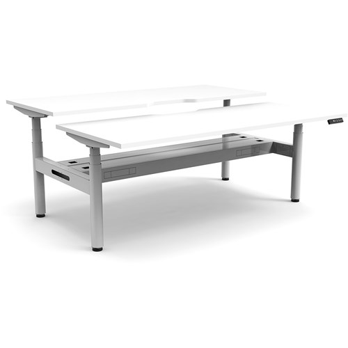 White top with White frame. Unit Dimension: 1500mm W x 1500mm D x 620-1270mm H. 750mm depth per user. E0 rated top. Powdercoat base. Digital control panel with 3 pre-set positions, LED display panel, keypad safety lock & reminder alarm setting. Anti-collision technology, noise emission of less than 50DB. Lifting capacity of 120kg with a max speed of 38mm per second. 70mm diameter round column legs. 700mm wide foot size with adjustable leveling feet, return foot: 700mm. Comes with cable tray for cable management. 10 Year Manufacturer's Warranty. Delivery, installation and assembly charges may apply to furniture. Please enquire to confirm.