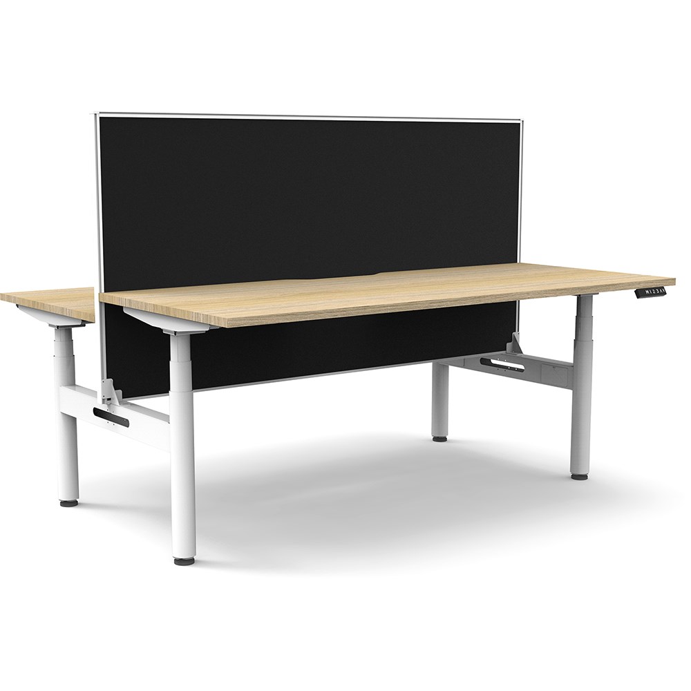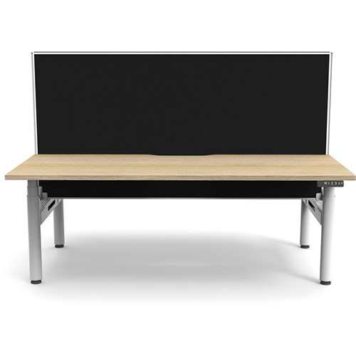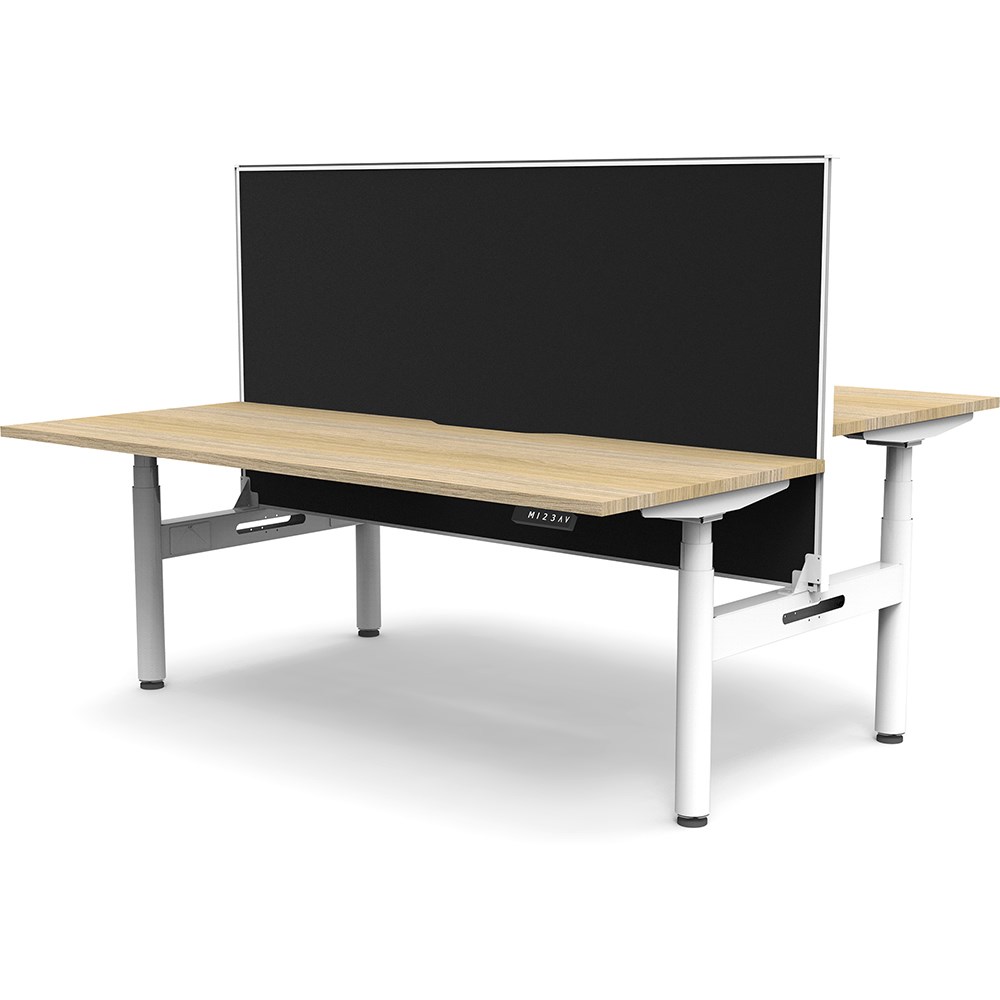 Natural Oak top with White frame. Unit Dimension: 1200mm W x 1500mm D x 1330mm H. 620-1270mm height range for desk, 750mm depth per user. E0 rated top. Powdercoat base. Digital control panel with 3 pre-set positions, LED display panel, keypad safety lock & reminder alarm setting. Anti-collision technology, noise emission of less than 50DB. Lifting capacity of 120kg with a max speed of 38mm per second. 70mm diameter round column legs. 700mm wide foot size with adjustable leveling feet, return foot: 700mm. Comes with 30mm thick privacy screen. 10 Year Manufacturer's Warranty. Delivery, installation and assembly charges may apply to furniture. Please enquire to confirm.