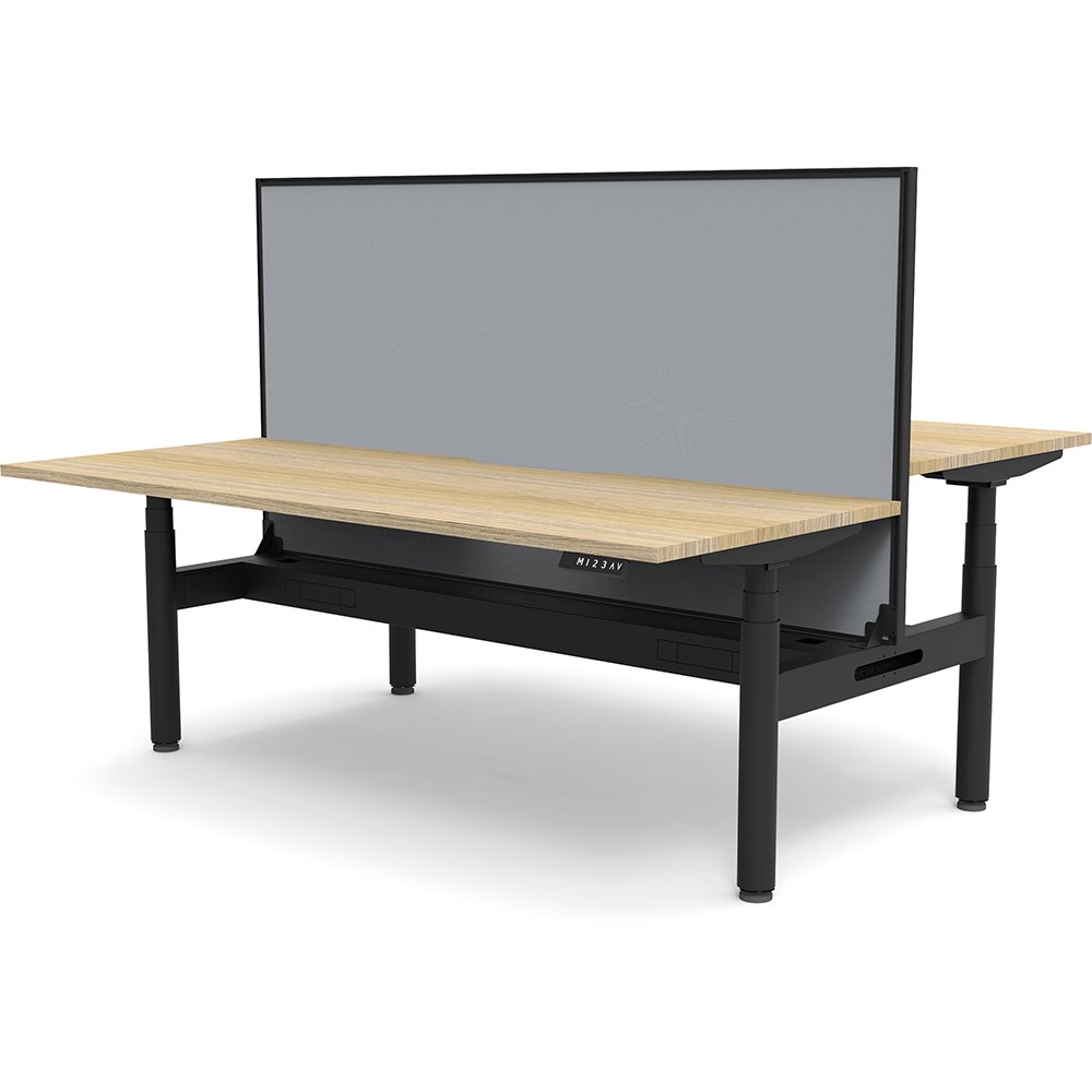 Natural Oak top with Black frame. Unit Dimension: 1500mm W x 1500mm D x 1330mm H. 620-1270mm height range for desk, 750mm depth per user. E0 rated top. Powdercoat base. Digital control panel with 3 pre-set positions, LED display panel, keypad safety lock & reminder alarm setting. Anti-collision technology, noise emission of less than 50DB. Lifting capacity of 120kg with a max speed of 38mm per second. 70mm diameter round column legs. 700mm wide foot size with adjustable leveling feet, return foot: 700mm. Comes with 30mm thick privacy screens and cable tray for cable management. 10 Year Manufacturer's Warranty. Delivery, installation and assembly charges may apply to furniture. Please enquire to confirm.