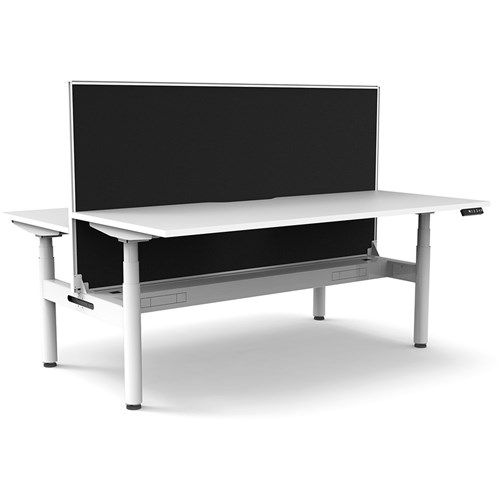 White top with White frame. Unit Dimension: 1800mm W x 1500mm D x 1330mm H. 620-1270mm height range for desk, 750mm depth per user. E0 rated top. Powdercoat base. Digital control panel with 3 pre-set positions, LED display panel, keypad safety lock & reminder alarm setting. Anti-collision technology, noise emission of less than 50DB. Lifting capacity of 120kg with a max speed of 38mm per second. 70mm diameter round column legs. 700mm wide foot size with adjustable leveling feet, return foot: 700mm. Comes with 30mm thick privacy screens and cable tray for cable management. 10 Year Manufacturer's Warranty. Delivery, installation and assembly charges may apply to furniture. Please enquire to confirm.