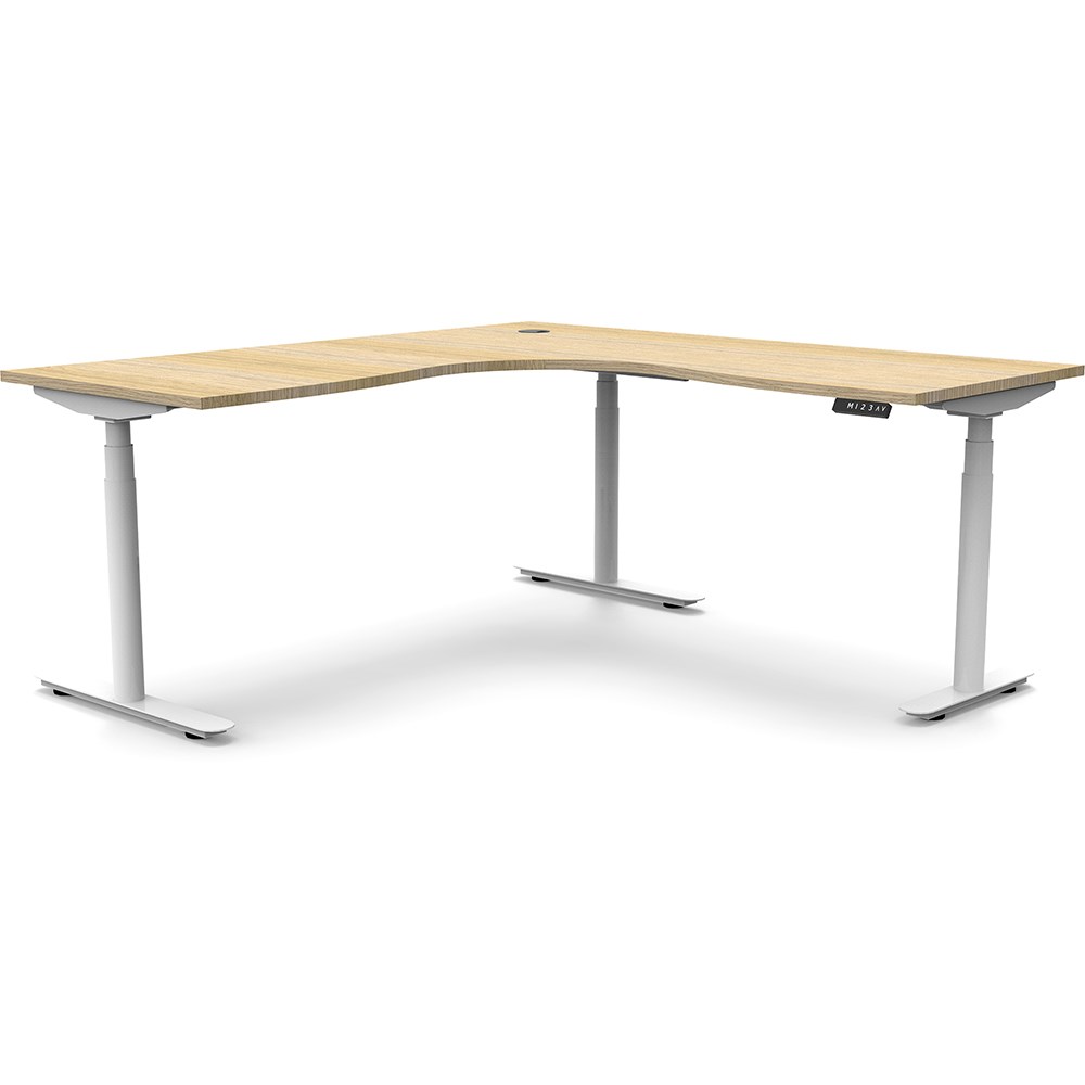 Natural Oak top with White frame. Unit Dimension: 1500/1500mm W x 750mm D x 620-1270mm H. E0 rated top. Powdercoat base. Digital control panel with 3 pre-set positions, LED display panel, keypad safety lock & reminder alarm setting. Anti-collision technology, noise emission of less than 50DB. Lifting capacity of 120kg with a max speed of 38mm per second. 70mm diameter round column legs. 700mm wide foot size with adjustable leveling feet, return foot: 700mm. 10 Year Manufacturer's Warranty. Delivery, installation and assembly charges may apply to furniture. Please enquire to confirm.