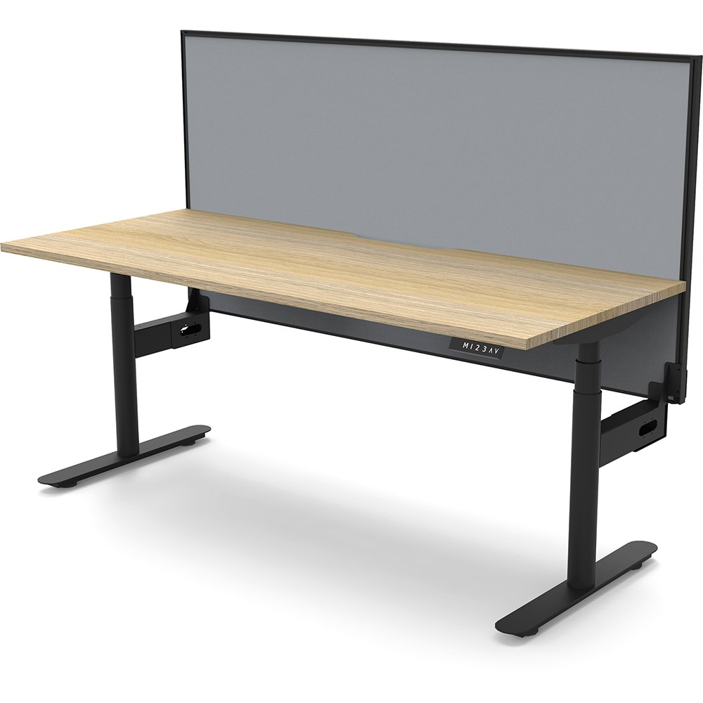 Natural Oak top with Black frame. Unit Dimension: 1200mm W x 750mm D x 1330mm H. 620-1270mm height range for desk. E0 rated top. Powdercoat base. Digital control panel with 3 pre-set positions, LED display panel, keypad safety lock & reminder alarm setting. Anti-collision technology, noise emission of less than 50DB. Lifting capacity of 120kg with a max speed of 38mm per second. 70mm diameter round column legs. 700mm wide foot size with adjustable leveling feet, return foot: 700mm. Comes with 30mm thick privacy screen. 10 Year Manufacturer's Warranty. Delivery, installation and assembly charges may apply to furniture. Please enquire to confirm.