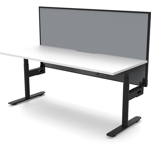 White top with Black frame. Unit Dimension: 1500mm W x 750mm D x 1330mm H. 620-1270mm height range for desk. E0 rated top. Powdercoat base. Digital control panel with 3 pre-set positions, LED display panel, keypad safety lock & reminder alarm setting. Anti-collision technology, noise emission of less than 50DB. Lifting capacity of 120kg with a max speed of 38mm per second. 70mm diameter round column legs. 700mm wide foot size with adjustable leveling feet, return foot: 700mm. Comes with 30mm thick privacy screen. 10 Year Manufacturer's Warranty. Delivery, installation and assembly charges may apply to furniture. Please enquire to confirm.