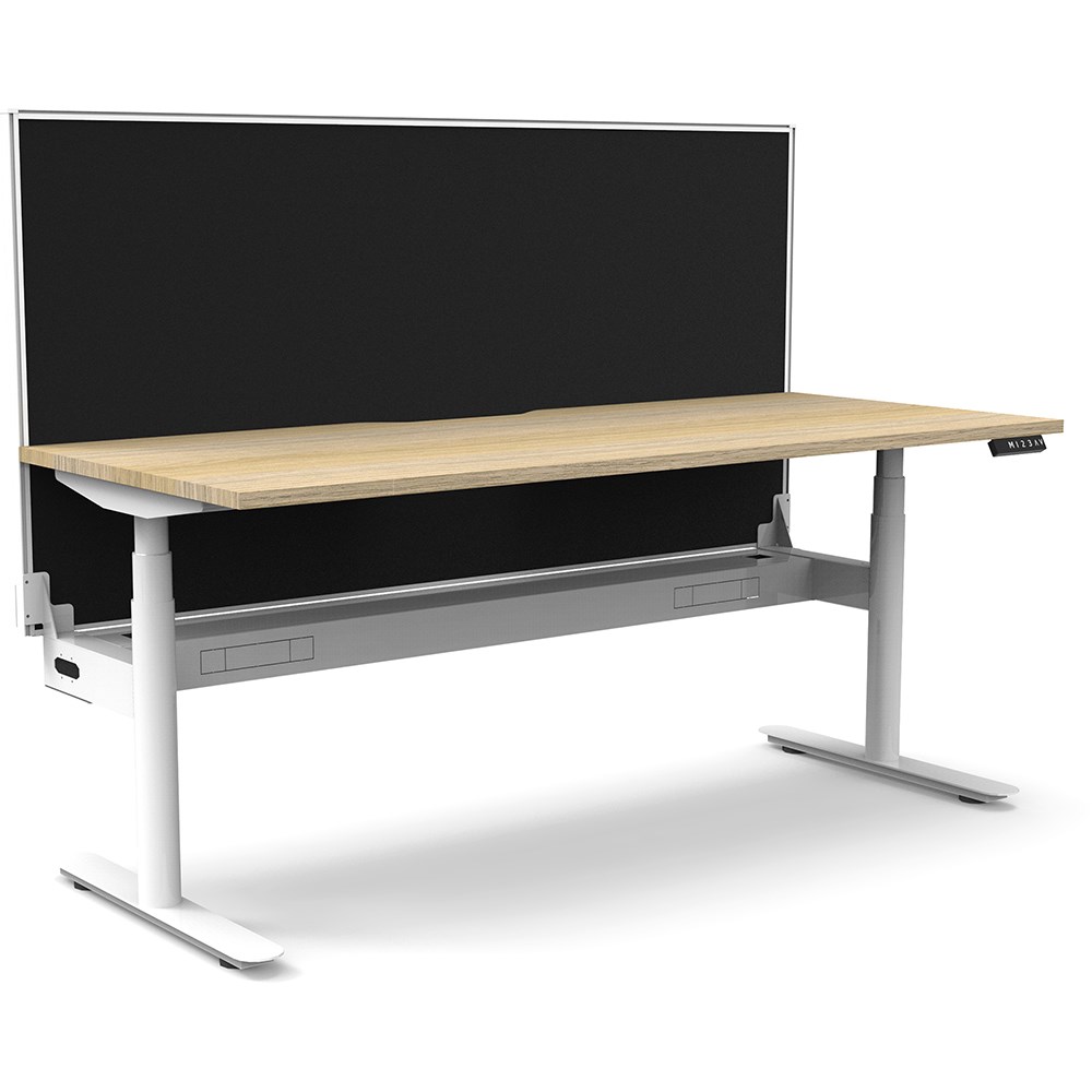 Natural Oak top with White frame. Unit Dimension: 1200mm W x 750mm D x 1330mm H. 620-1270mm height range for desk. E0 rated top. Powdercoat base. Digital control panel with 3 pre-set positions, LED display panel, keypad safety lock & reminder alarm setting. Anti-collision technology, noise emission of less than 50DB. Lifting capacity of 120kg with a max speed of 38mm per second. 70mm diameter round column legs. 700mm wide foot size with adjustable leveling feet, return foot: 700mm. Comes with 30mm thick privacy screens and cable tray for cable management. 10 Year Manufacturer's Warranty. Delivery, installation and assembly charges may apply to furniture. Please enquire to confirm.