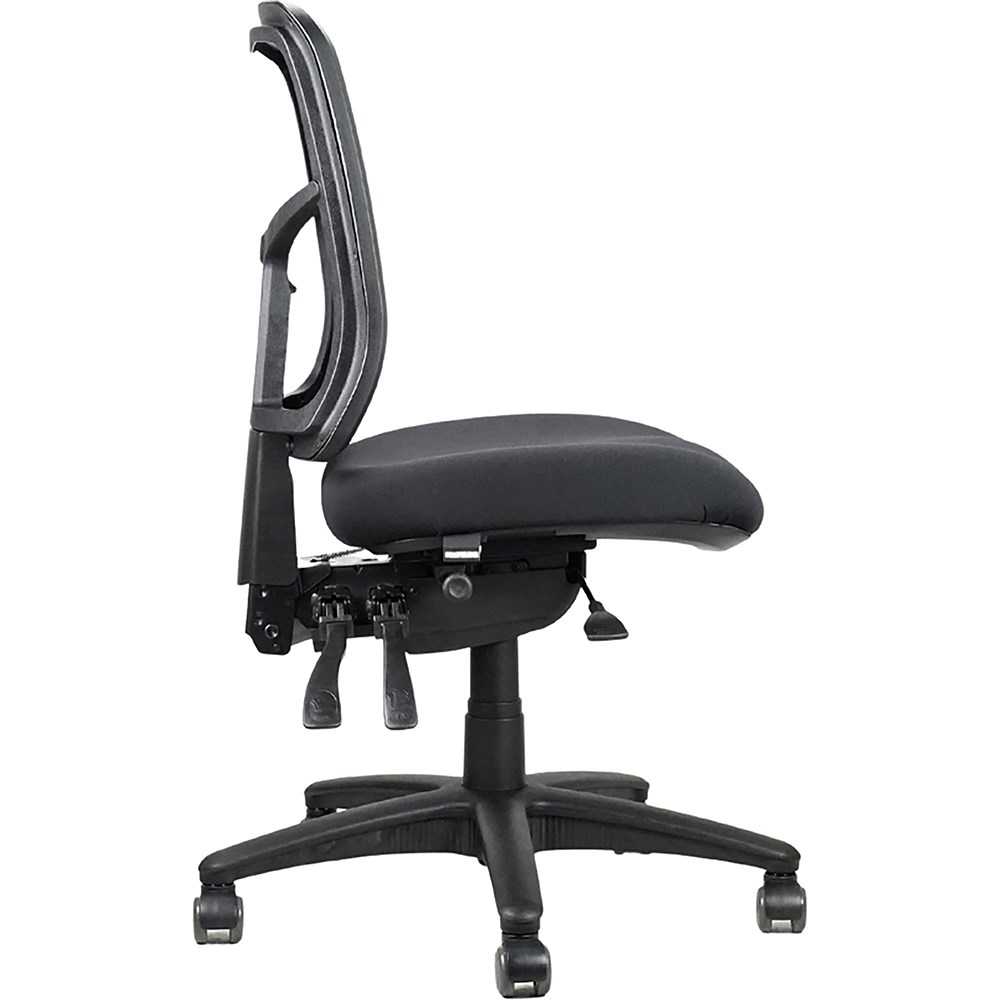 Fully ergonomic 4 lever heavy duty mechanism with seat slide. Upholstered seat. Heavy duty five star spider base with 50mm hard floor castors. Luxurious heavy duty moulded foam seat. Height adjustable ratchet back. AFRDI load rated to 160kg. Overall size of 510mm W x 560mm D x 950 - 1150mm H. Seat size of 510mm W x 470mm D, seat height 490 - 630mm H. 10 Year Manufacturer's Warranty. Delivery, installation and assembly charges may apply to furniture. Please enquire to confirm. Optional adjustable armrest available. Refer to product code 2834421.