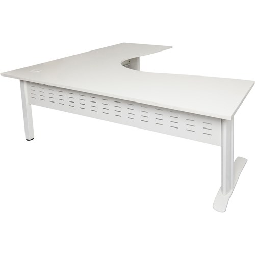 Natural White top and White frame. One piece corner workstation with 25mm top. Sturdy powder coated frame and legs. Comes with metal perforated modesty panel and cable tidy. E0 Enviroboard top. 1 x 80mm cable entry hole in corner of top. Adjustable feet. 5 Years Manufacturer's Warranty. Delivery, installation and assembly charges may apply to furniture. Please enquire to confirm.