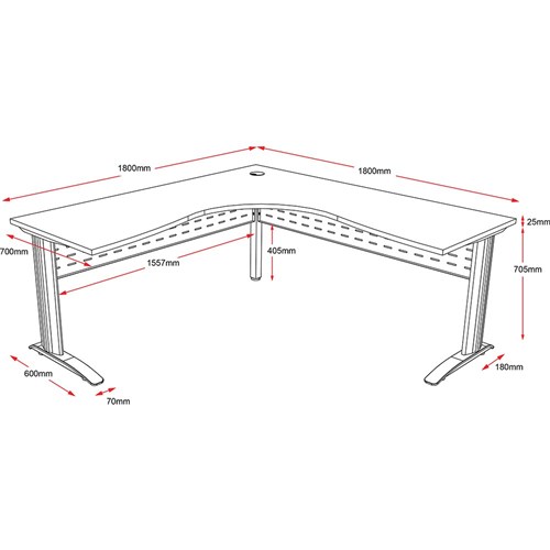 Natural White top and Silver frame. One piece corner workstation with 25mm top. Sturdy powder coated frame and legs. Comes with metal perforated modesty panel and cable tidy. E0 Enviroboard top. 1 x 80mm cable entry hole in corner of top. Adjustable feet. 5 Years Manufacturer's Warranty. Delivery, installation and assembly charges may apply to furniture. Please enquire to confirm.
