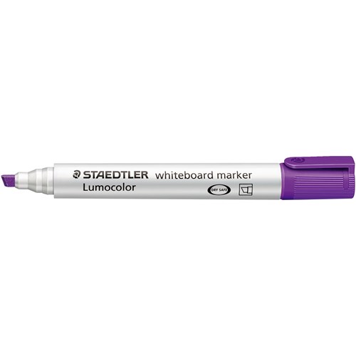 Violet marker can be dry-wiped from whiteboards and surfaces such as glass and porcelain without leaving a trace Airplane-safe Fast drying, low odour and with convenient clip cap Dry safe Stand-up Staedtler box converts to convenient desk set Refillable xylene and toluene free ink Polypropylene barrel and cap guarantee long service life Chisel tip line width approximately 2 - 5mm