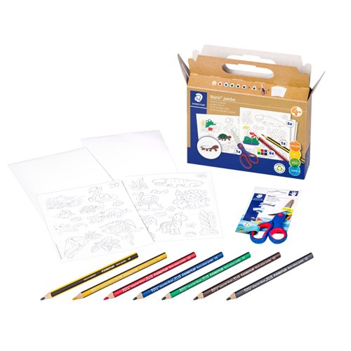 Set provides hours of colouring, playing and learning for children. Designed for children aged 4+ in mind. Suitable as a gift or travel companion for children thanks to practical suitcase packaging. 61 C3 contains: 4 x sticker sheets with wildlife figures, 6 x Noris jumbo colouring pencils, 1 x Noris graphite pencil, 1 x Noris crafting scissors.
