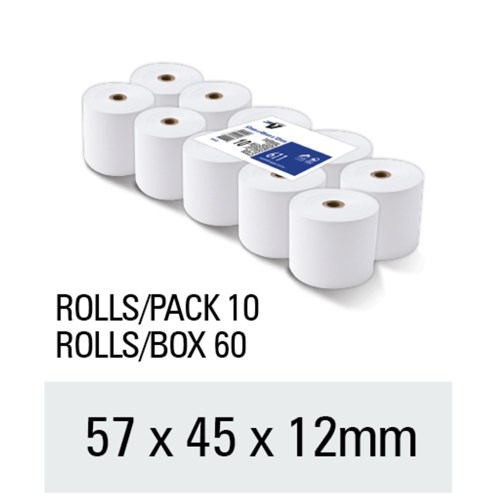 Suitable for use in most cash registers and EFTPOS terminals. Paper weight: 58gsm. Roll size: 57 x 45mm. Core size: 11.5mm. Roll length: 90m. 1 ply. Lint free. Pack of 10.