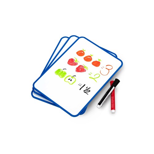 Double sided, Plain both sides. Lightweight magnetic whiteboards ideal for agile education. Great for collaborative group and individual focused learning. Add the optional Magnetic eraser/marker to make a complete individual student whiteboard solution, please see product 3039136. Size: 297W x 210mmH. Sturdy navy blue moulded frame. Save paper and allow students to practice skills. Use any whiteboard markers, wipes clean easily.