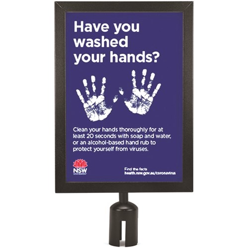 Suits VQ2542B (2325288). Powder coated black. Double sided A4 sign holder. Insert your sign between the perspex covers. Simply fits over top of Retracta Q. Made for use with Retracta Q only.