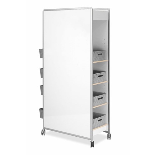 Dimensions: 840W x 374D x 1800mmH. Includes 10 shelves and 10 baskets. Easily movable double sided magnetic whiteboard with storage that is split into two making it perfect for shared and adaptable learning environments. Easy pull handle on either end. Four large easy glide castors with 2 lockable. Delivery, installation and assembly charges may apply to furniture. Please enquire to confirm.