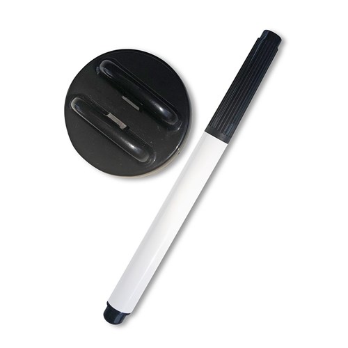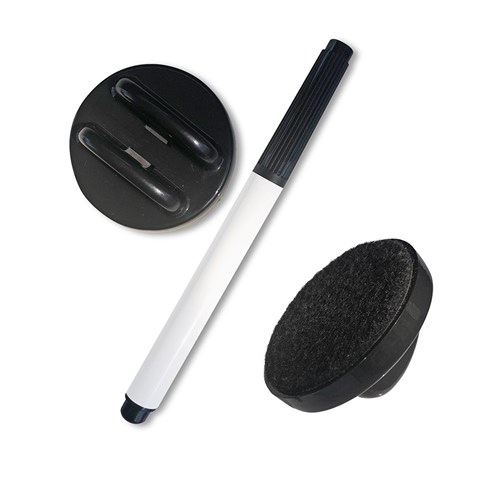 Eraser and pen holder with pen. Magnetic eraser holds the included pen. 50mm diameter eraser. Black fine point whiteboard pen included.