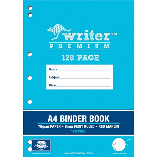 Writer Premium Binder Books feature heavy duty covers, high quality white 70gsm paper with blue ruled lines and a red margin 7 holes to suit ring binders Unique cover colours and teachers references make each book easy to recognize Writer Premium Exercise Books also include an activity page, maths tables and conversion charts The Premium choice for all your school work