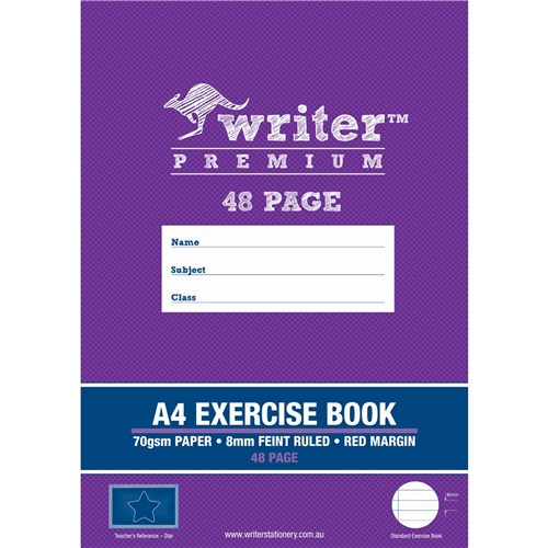 Writer Premium Exercise Books feature heavy duty covers, high quality white 70gsm paper with blue ruled lines and a red margin Unique cover colours and teachers references make each book easy to recognize Writer Premium Exercise Books also include an activity page, maths tables and conversion charts The Premium choice for all your school work