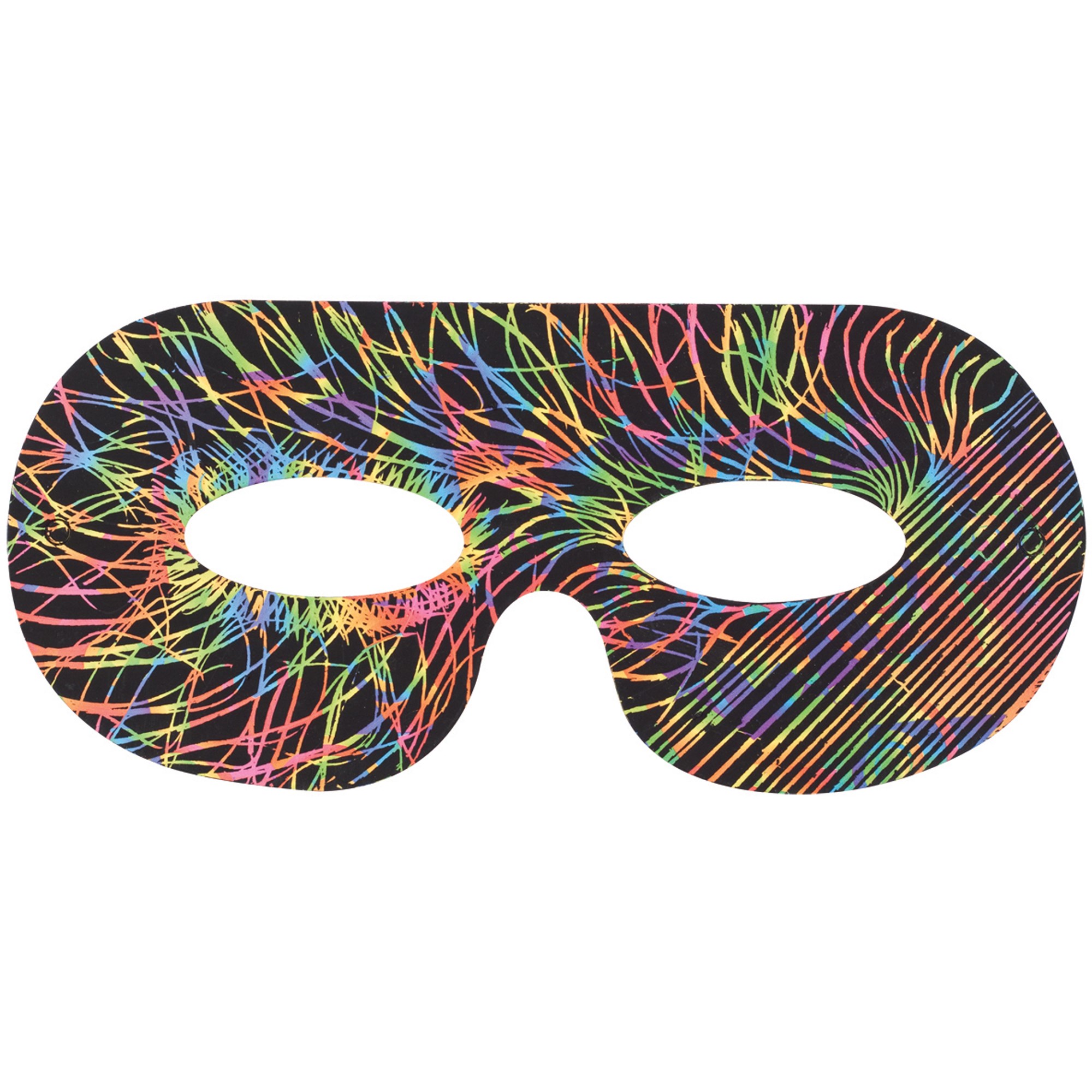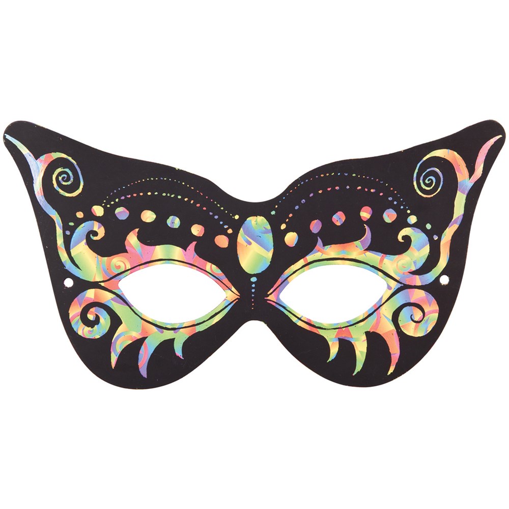 Create a decorative mask with this scratch art card simply by using a wooden stylus to draw with. Two designs. Pre-cut masks. Includes 10 scratch tools and elastic. Bright rainbow colours underneath the black coating.